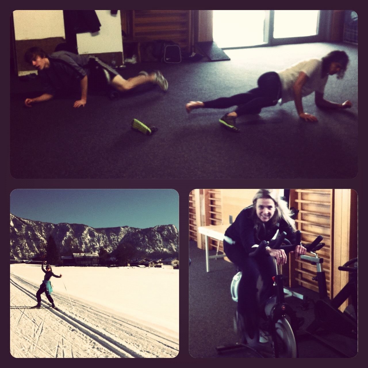| Brian/Jeffrey warming up, cross country skiing, mom getting in her workout |